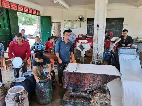 在龍江分公司雄英2隊收膠站,膠工、膠農們紛紛前來公司收膠站賣膠水。袁國華攝