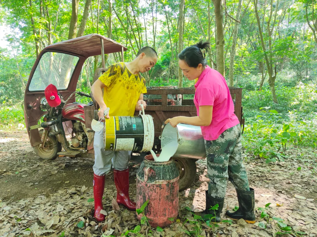 在位于海南島西部的西聯橡膠園里,割膠工人正在熟練地割膠。膠刀劃過處,乳白色的膠水緩緩流出,滴進綁扎在橡膠樹上的膠水收集器具里。隨后,所有的膠水會被運送到橡膠加工廠,根據需要加工成膠塊或濃乳,再發往全國各地進行二次加工。
